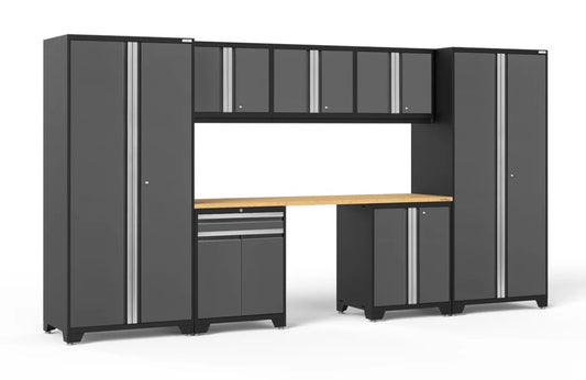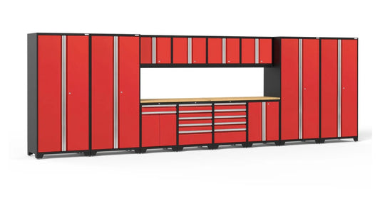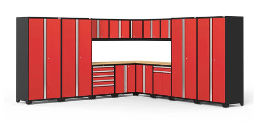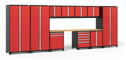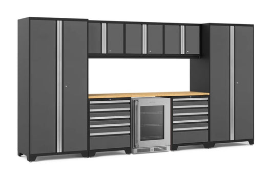 Ensemble de 9 armoires Pro Series avec mur, tiroir à outils, casiers et réfrigérateur à porte vitrée