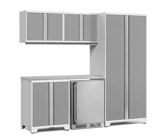 Ensemble de 6 armoires Pro Series avec base, armoire murale, casier et réfrigérateur à porte en acier inoxydable