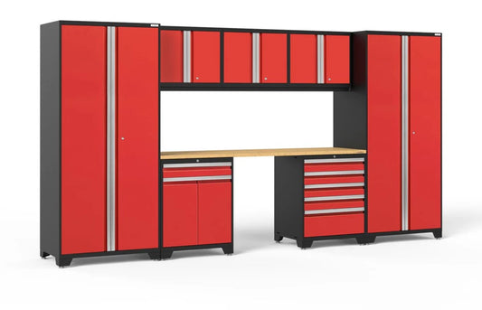 Ensemble de 9 armoires Pro Series avec mur, tiroir à outils, casiers et réfrigérateur à porte vitrée