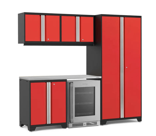 Ensemble de 6 armoires Pro Series avec base, armoire murale, casier et réfrigérateur à porte vitrée